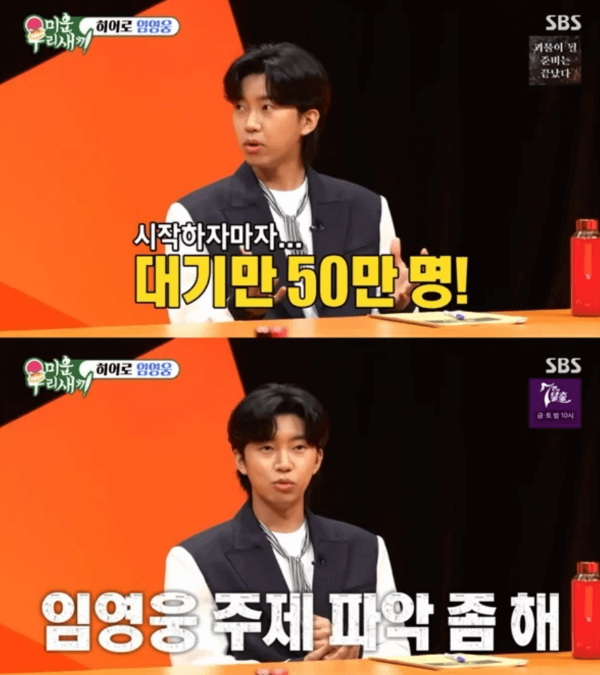 17일 방영된 sbs 예능 미운 우리 새기에 임영웅이 팬들과 할머니를 위해 특별 mc로 방문하였습니다. 이날 방송에서는 임영우의 콘서트 예매 후기에 대한 이야기가 나왔습니다. 직접 본인 콘서트 티켓팅에 도전해 본 임영웅은 시작과 동시에 대기 50만 명이라는 대기숫자를 봤다고 밝혔습니다. 이에 엠씨들도 다른 팬분들을 위해 더 큰 공연장에서 해달라는 조언을 해주었습니다. 부디 다음 콘서트에는 주제파악해서 큰 공연장에서 오래오래 투어를 해주시길 바랍니다.